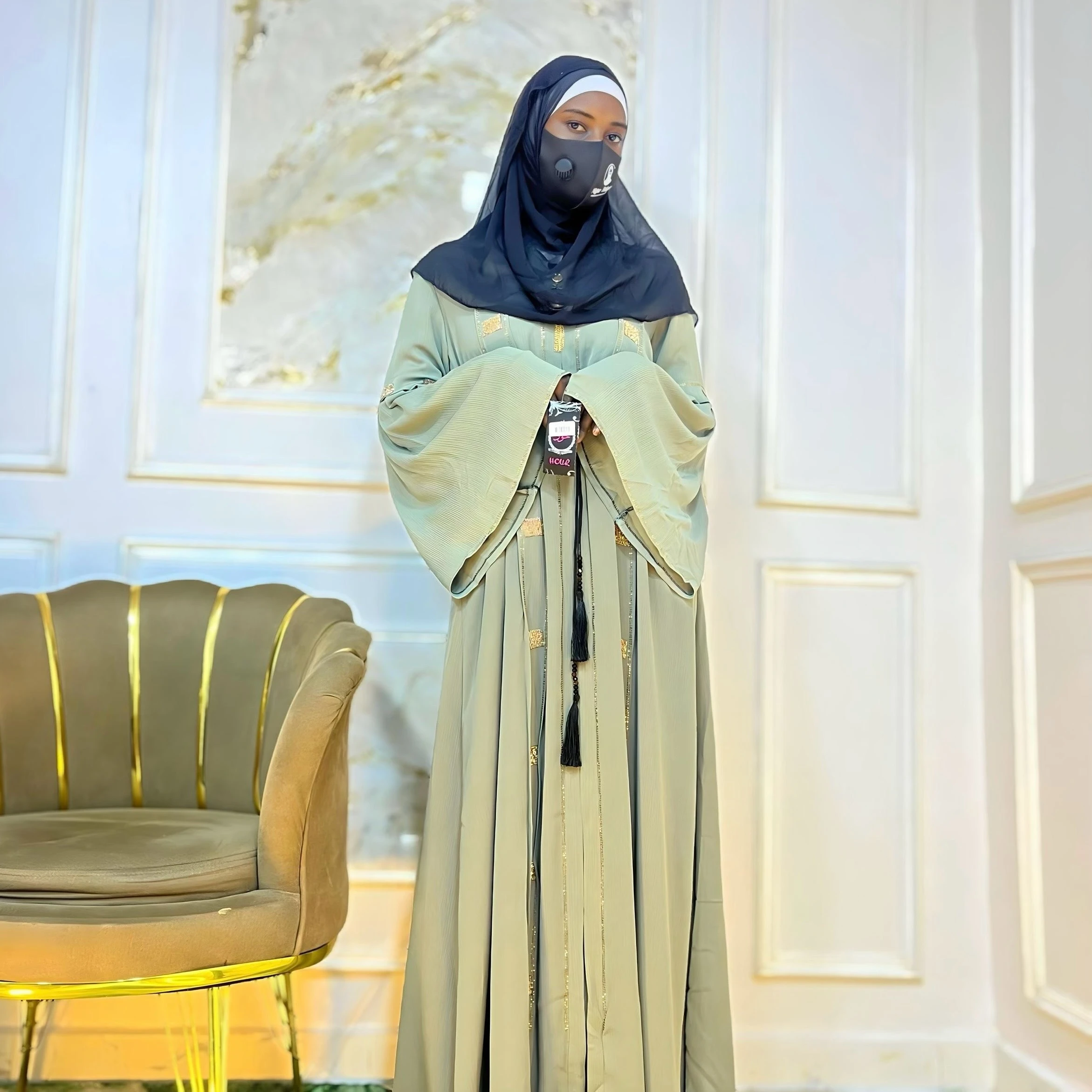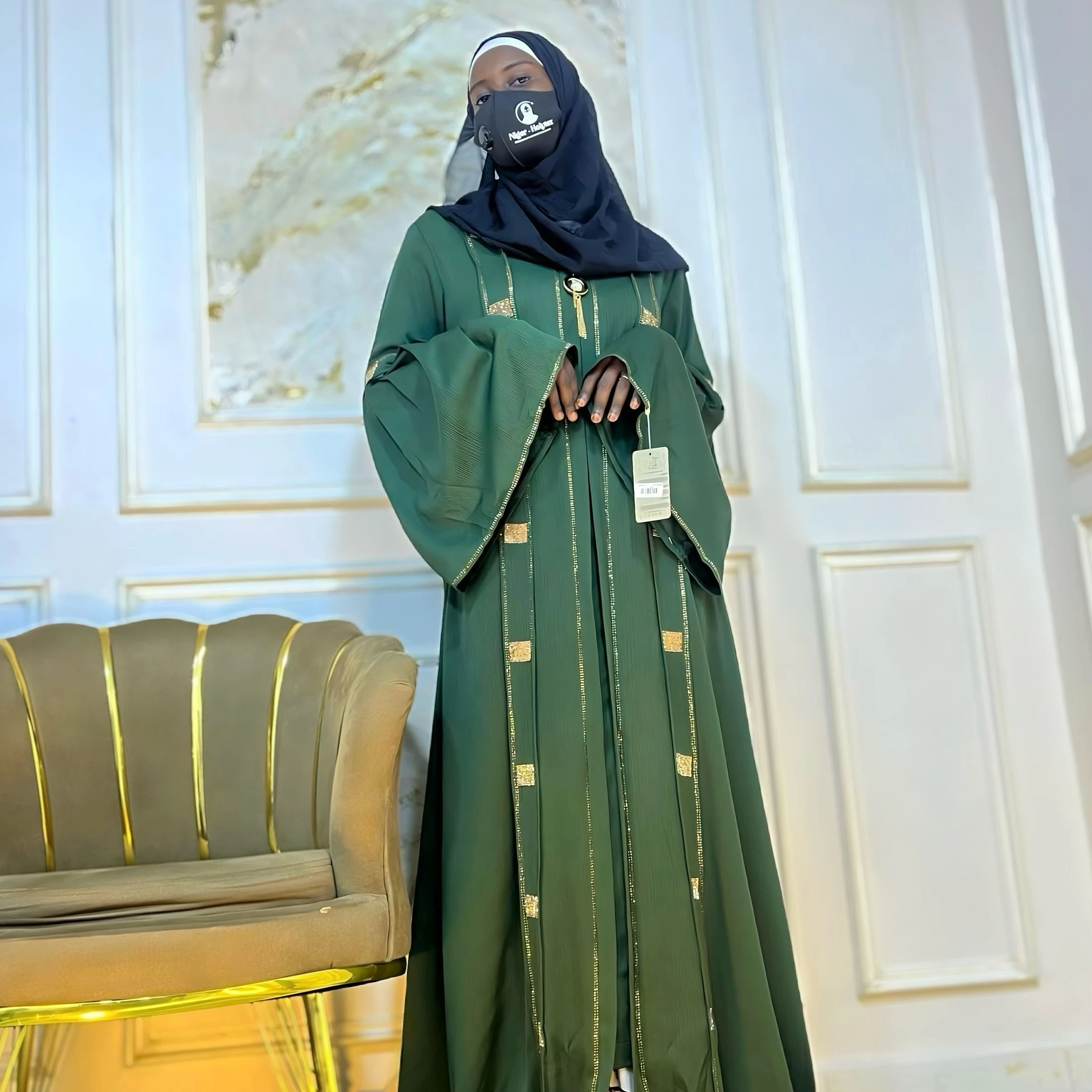Un modèle qui respire la classe. Son tissu fluide, ses manches larges et ses touches dorées apportent une allure noble et raffinée.