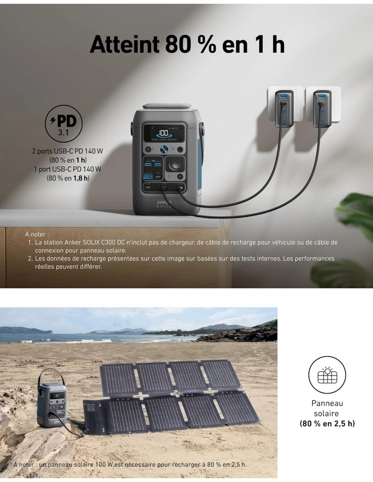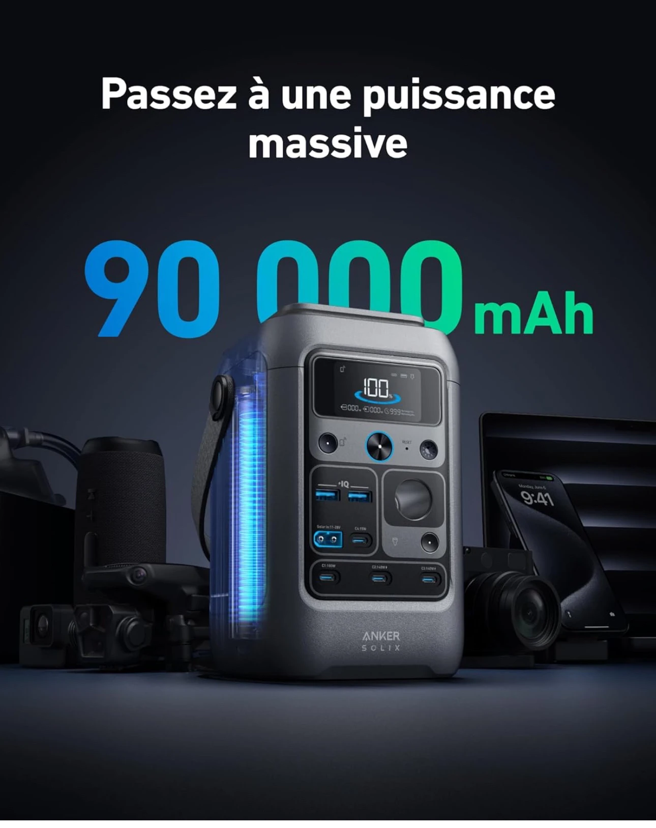 Puissante et compacte, la SOLIX C300 est une batterie portable de 90 000 mAh (288Wh), capable de délivrer jusqu’à 300W. Parfaite pour la maison, le travail ou vos aventures en extérieur.