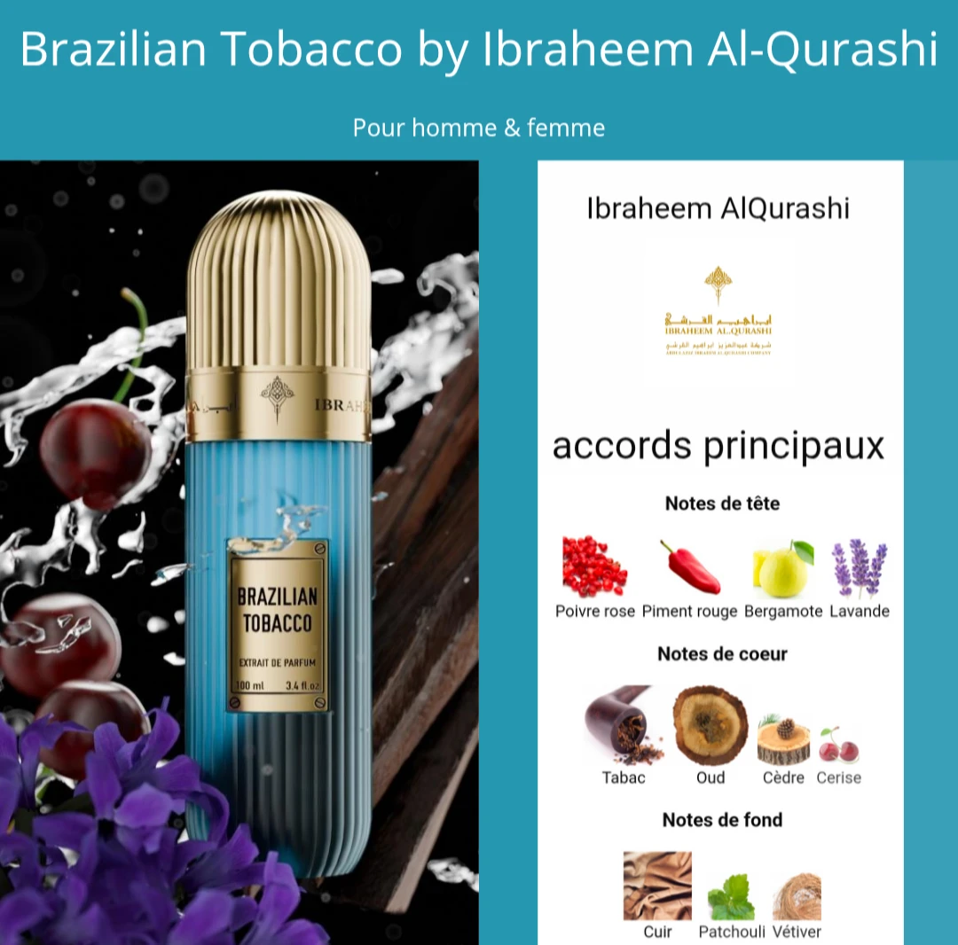 Pyramide olfactive : Notes de tête : Poivre rose, Piment rouge, Bergamote, Lavande. Notes de cœur : Tabac, Oud, Cèdre, Cerise. Notes de fond : Cuir, Patchouli, Vétiver. Détails du parfum Concentration : Extrait de Parfum (PE) Volume : 100 ml Genre : Homme & Femme Marque : Ibraheem Al Qurashi