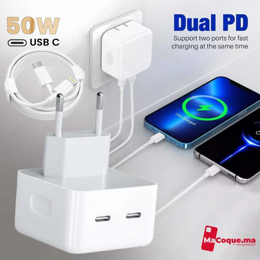 Chargeur PD 50W Double sortie USB-C Avec un Cable Apple USB-C to Lightning