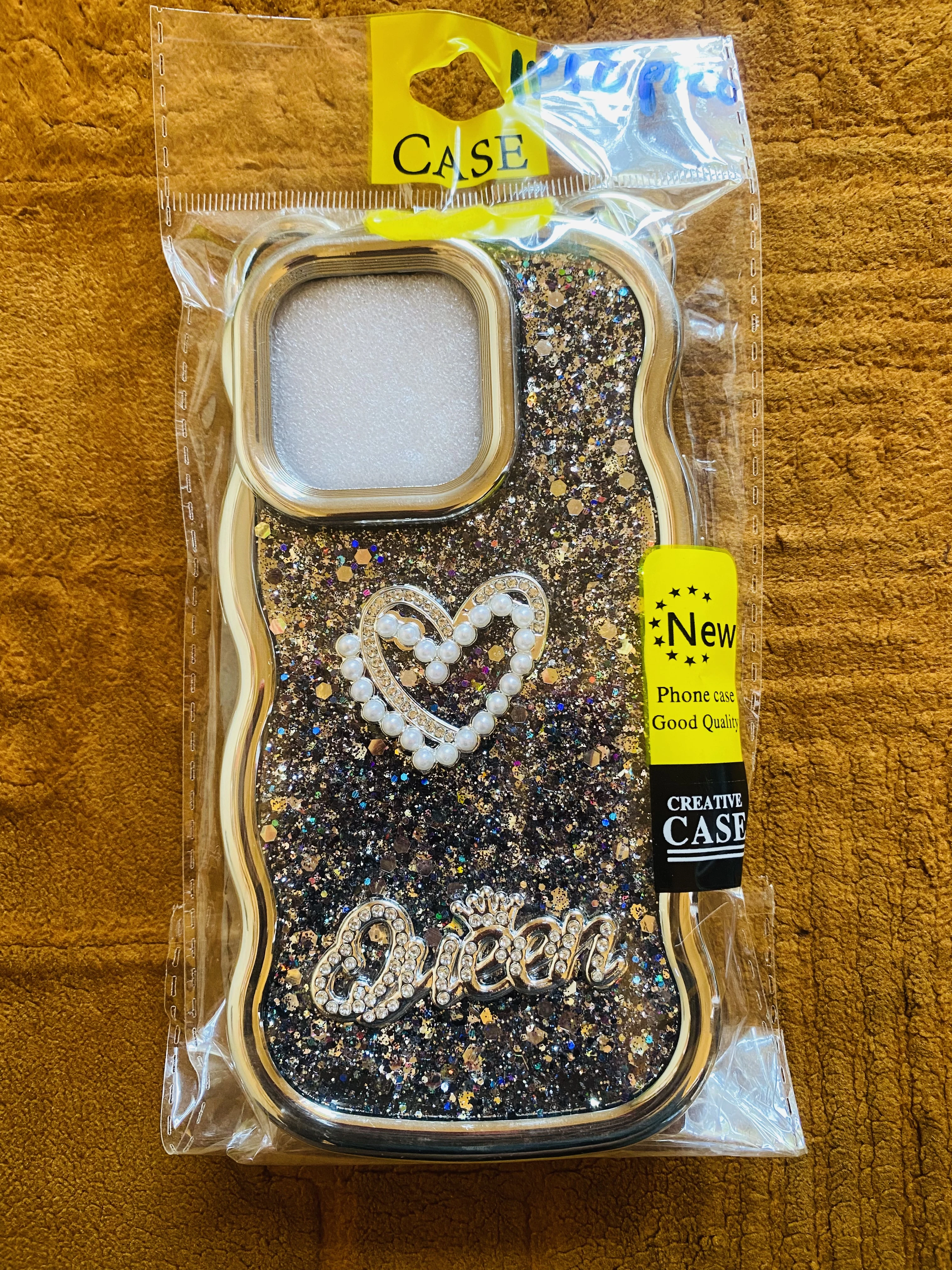 L'image montre une coque de téléphone portable, probablement pour un iPhone 12/12Pro, avec un design pailleté et l'inscription "Queen" ornée de strass, ainsi qu'un motif en forme de cœur avec des perles et des strass. Il s'agit d'une coque "Creative Case" de "bonne qualité".