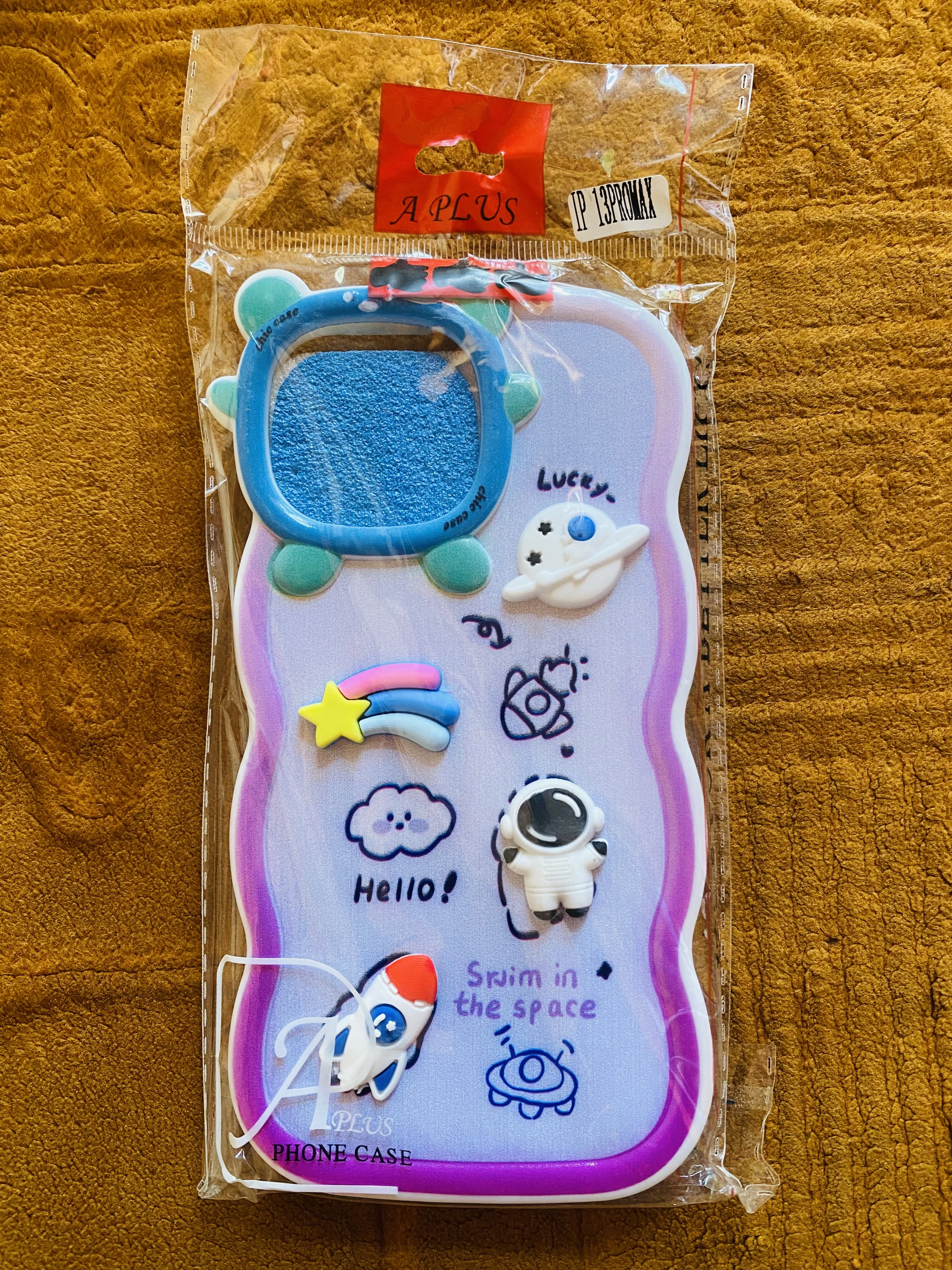 Ceci est une coque de téléphone "A Plus" pour iPhone 13 Pro Max, avec un thème spatial. Modèle compatible : iPhone 13 Pro Max (indiqué par "P13PR" sur l'emballage). Design : Thème spatial avec des éléments en relief comme un astronaute, une fusée, une étoile filante, une planète et des nuages, ainsi que les mots "Lucky", "Hello!" et "Swim in the space". Marque : A Plus. Type de produit : Coque de téléphone.