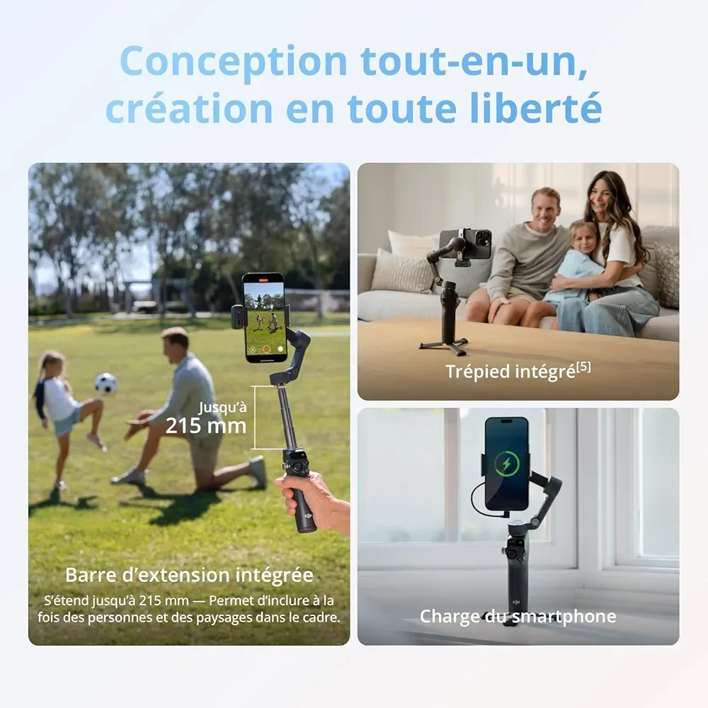 Transforme ton smartphone en véritable outil de création professionnelle avec le DJI Osmo Mobile 8. Conçu pour les créateurs de contenu, vloggers et passionnés de vidéo, ce stabilisateur offre une stabilisation 3 axes robuste pour des images fluides et sans tremblements, même en mouvement. Grâce à son suivi natif intelligent, combiné à la prise en charge de l’audio et de l’éclairage, capture chaque instant avec précision et qualité. Sa rotation panoramique à 360° permet des prises de vue dynamiques et immersives, tandis que la barre d’extension intégrée facilite les selfies, les plans larges et les angles créatifs. Avec une batterie offrant jusqu’à 10 heures d’autonomie, filme sans interruption, où que tu sois.