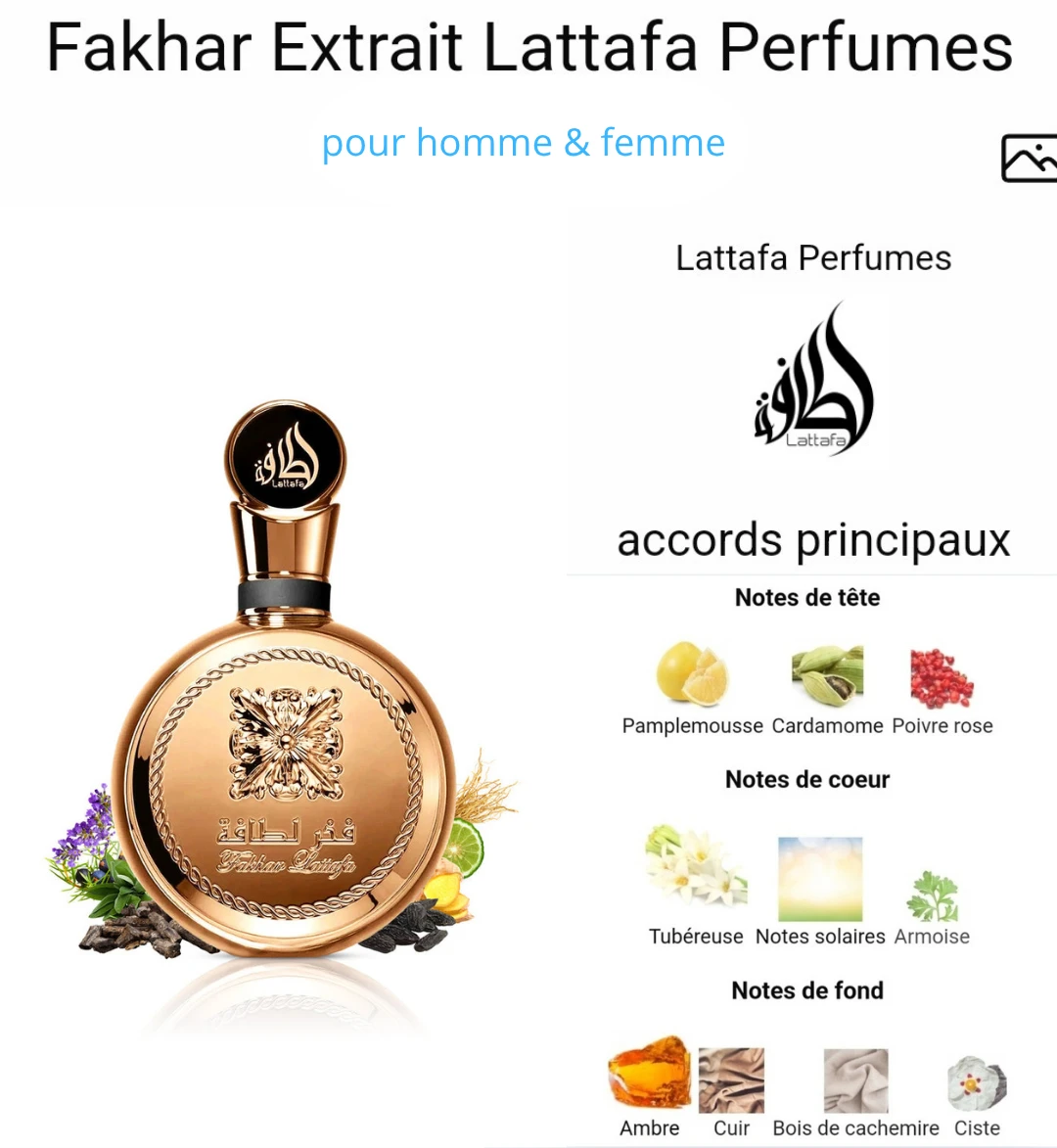 Fakhar Gold de Lattafa est un parfum oriental floral unisexe, mêlant douceur, épices et séduction dorée. Inspiré du célèbre 1 Million Parfum de Paco Rabanne, il incarne un équilibre parfait entre audace et élégance. L’ouverture pétillante de pamplemousse, cardamome et poivre rose laisse place à un cœur floral envoûtant composé de tubéreuse, de notes solaires et d’armoise. Enfin, la base chaleureuse de cuir, ambre, cashmeran et labdanum déploie un sillage sensuel et persistant. Une fragrance luxueuse et magnétique, idéale au quotidien comme pour les grandes occasions.