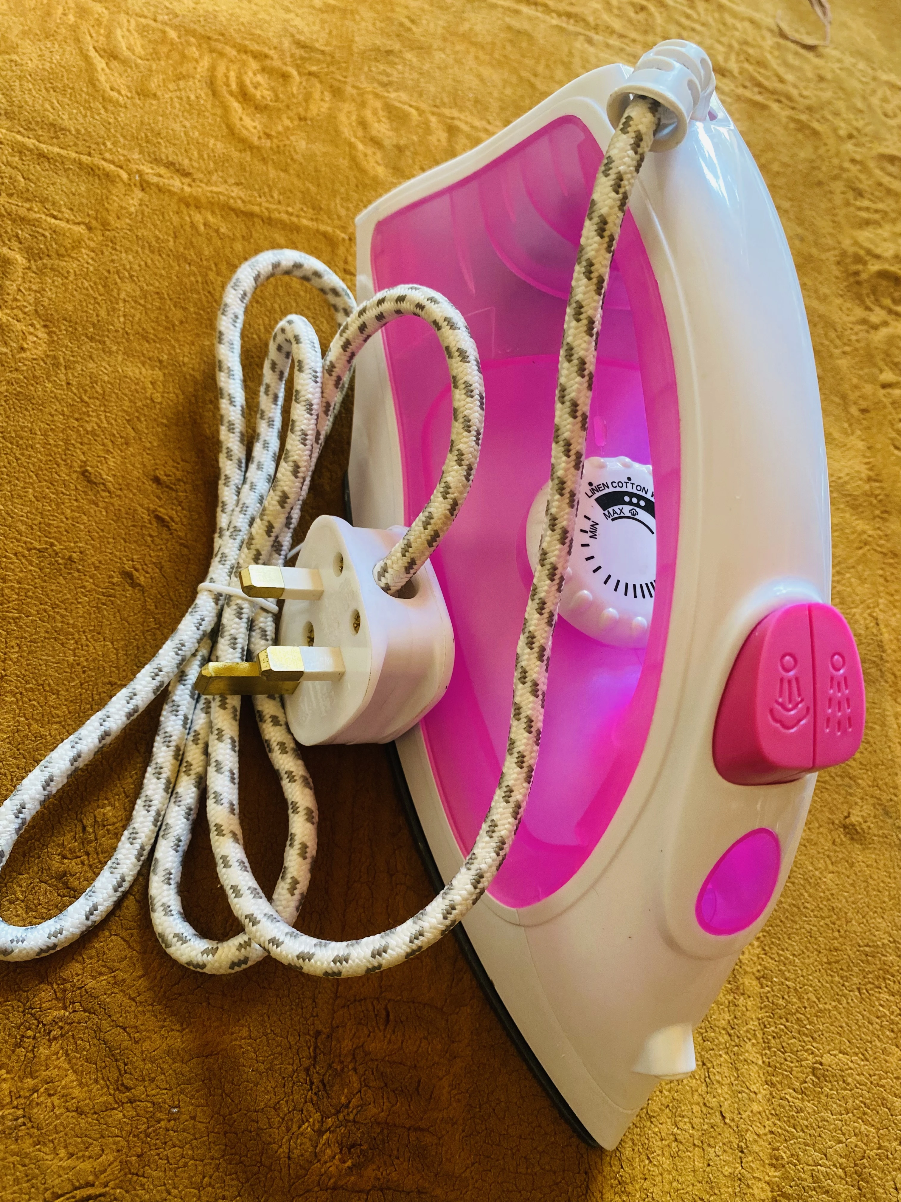 L'image montre un fer à repasser de voyage compact, de couleur blanche et rose, avec un cordon d'alimentation en tissu tressé.