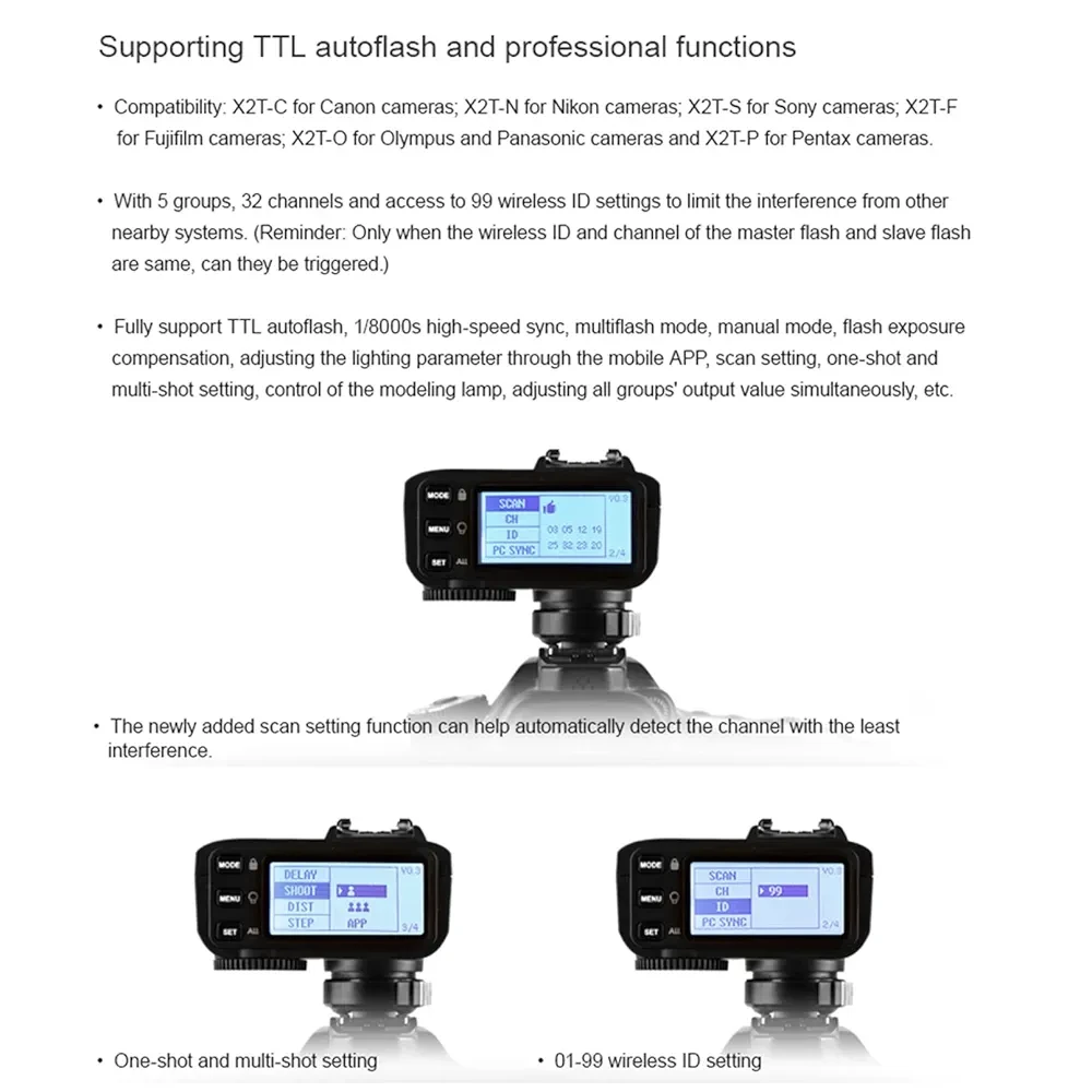 Le Godox X2T-C est un transmetteur de flash sans fil haute performance conçu pour les appareils photo Canon. Il prend en charge la synchronisation haute vitesse jusqu’à 1/8000s (HSS) et dispose d’une connexion Bluetooth pour un contrôle facile via smartphone. Avec ses 5 boutons de groupe distincts et ses 3 boutons de fonction, il permet un réglage rapide et précis de vos paramètres d’éclairage. Idéal pour les photographes professionnels ou passionnés à la recherche de fiabilité et de flexibilité.