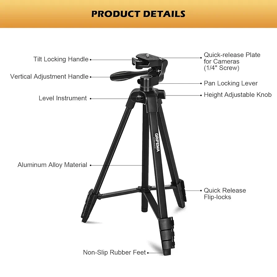 Le GRIFEMA GB1001 est un trépied pliable en aluminium de 140 cm (55”), conçu pour offrir stabilité et flexibilité à vos prises de vue. Équipé d’une télécommande Bluetooth et d’un support universel, il est compatible avec les smartphones iPhone/Android ainsi que les appareils photo numériques. Léger, robuste et facile à transporter, il vous permet de capturer photos et vidéos avec précision, que ce soit pour vos voyages, vos portraits ou vos contenus en ligne.