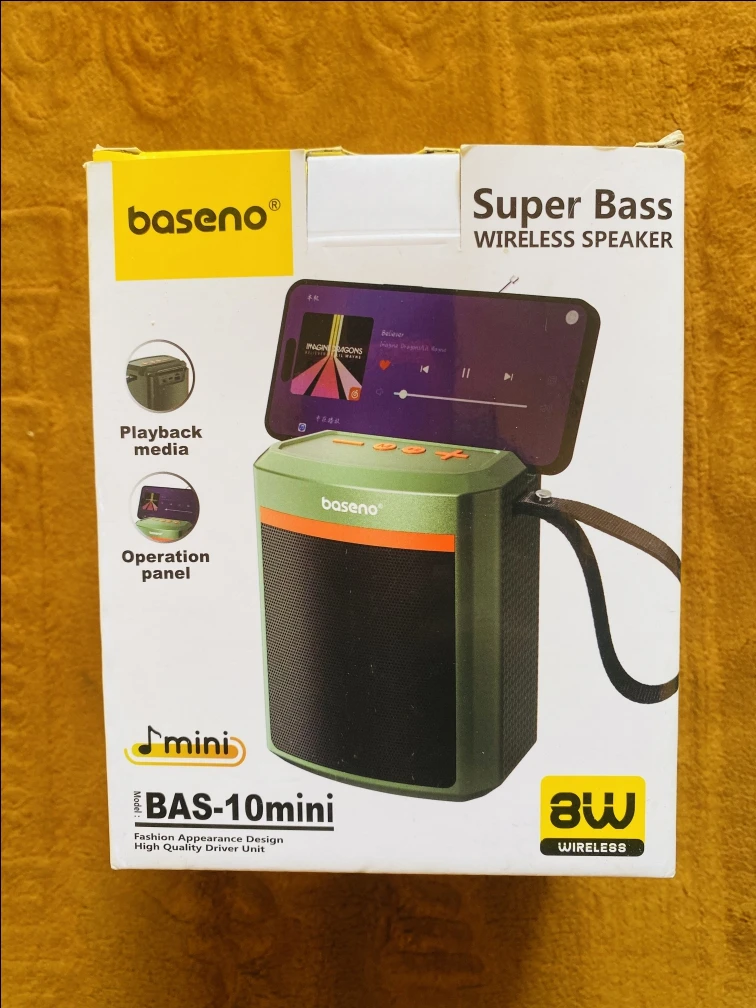L'image présente le haut-parleur sans fil Baseno BAS-10mini Super Bass. Il s'agit d'un haut-parleur sans fil avec une fonction Super Bass. Le modèle est le BAS-10mini. Il est conçu avec une apparence tendance et une unité de haut-parleur de haute qualité. Il a une puissance de 8W. Il est sans fil, comme indiqué par le texte "WIRELESS" et la mention "WIRELESS SPEAKER".