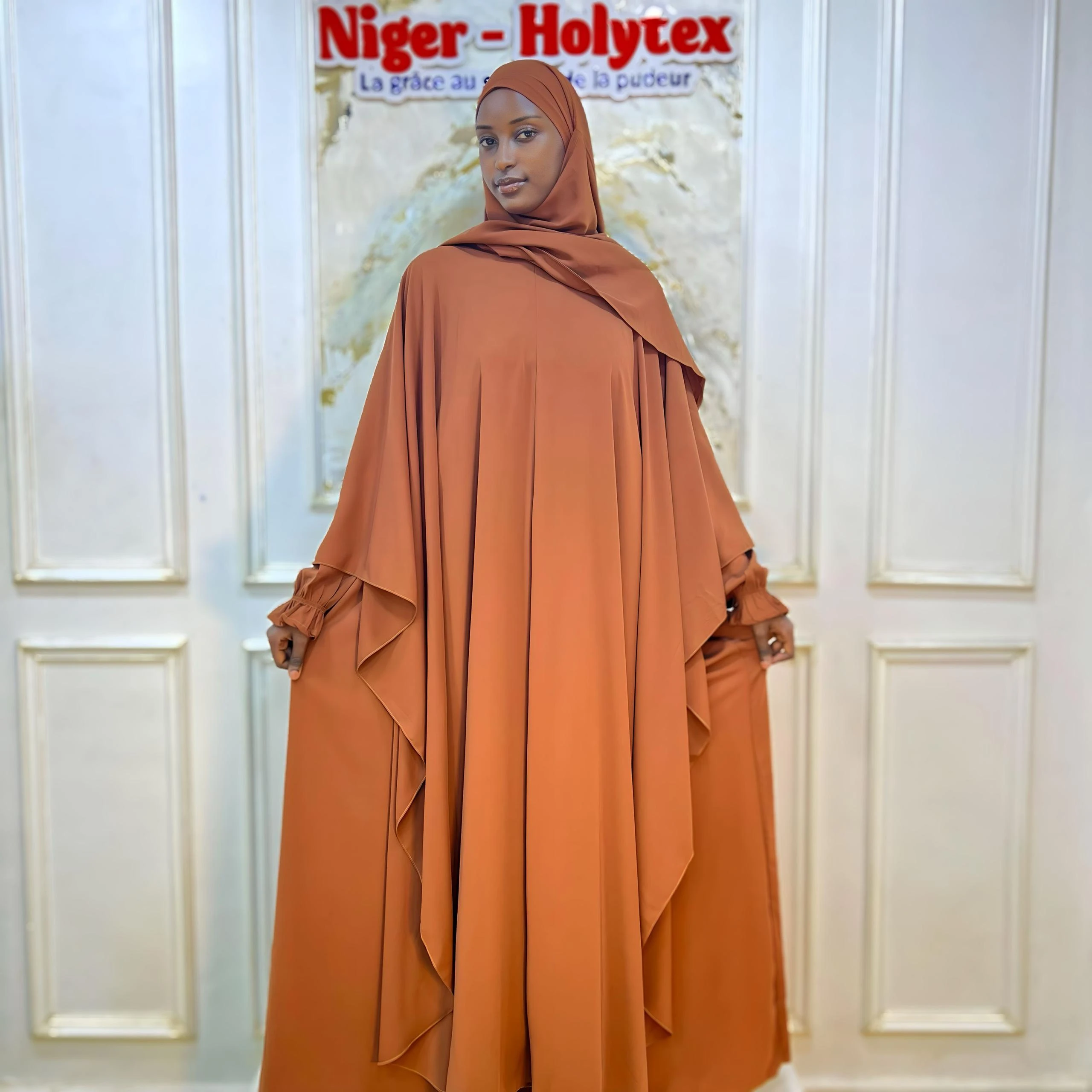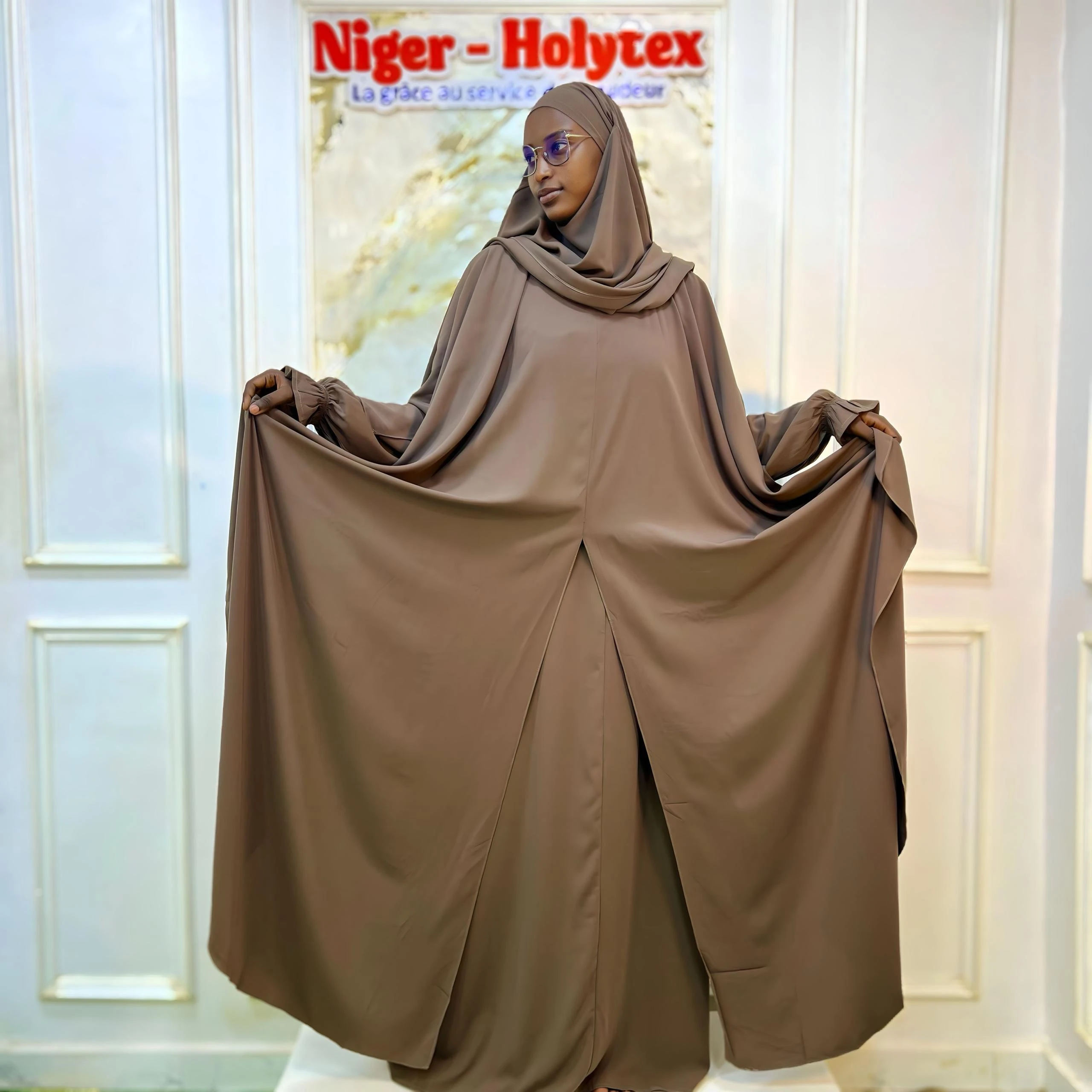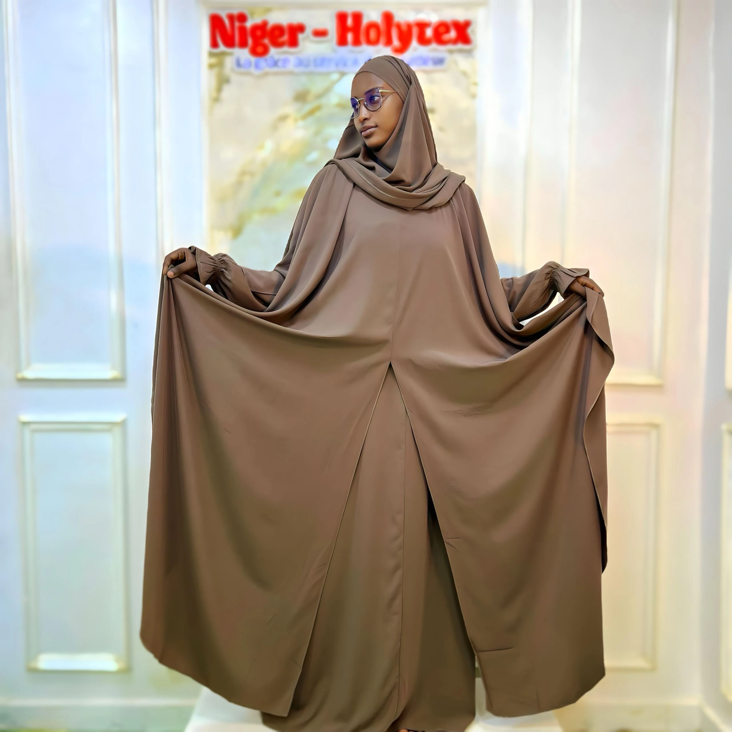Composé d’une robe fluide, cape, khimar long et niqab, ce modèle te permet 3 styles différents selon ton envie.