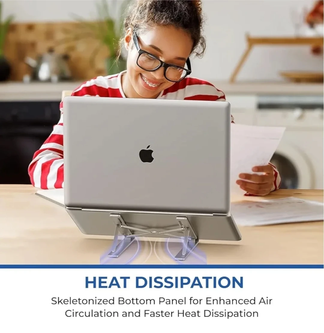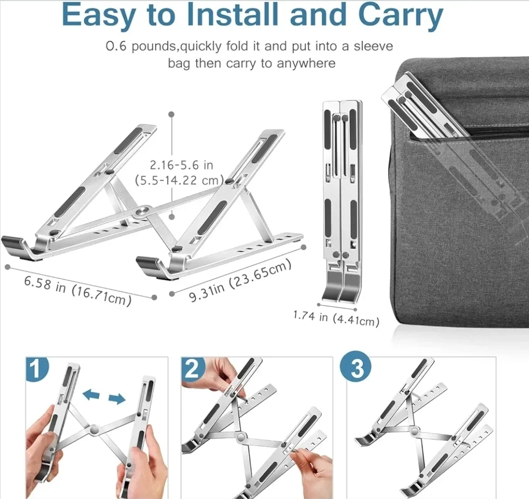 Ce support pour ordinateur portable réglable en aluminium est la solution idéale pour améliorer ton confort de travail au quotidien. Grâce à ses 6 niveaux de réglage, il permet d’ajuster facilement la hauteur et l’inclinaison afin d’adopter une posture ergonomique, réduire les douleurs cervicales et améliorer le confort visuel. Sa structure robuste en alliage d’aluminium épaissi assure une excellente stabilité et supporte en toute sécurité les ordinateurs de 10 à 17,3 pouces. Sa conception ajourée favorise une bonne circulation de l’air pour un refroidissement efficace, même lors d’une utilisation prolongée, tandis que les patins antidérapants en silicone maintiennent le PC bien en place et le protègent des rayures. Compact, léger et pliable, il se transporte facilement et convient parfaitement au télétravail, aux déplacements professionnels et aux voyages.