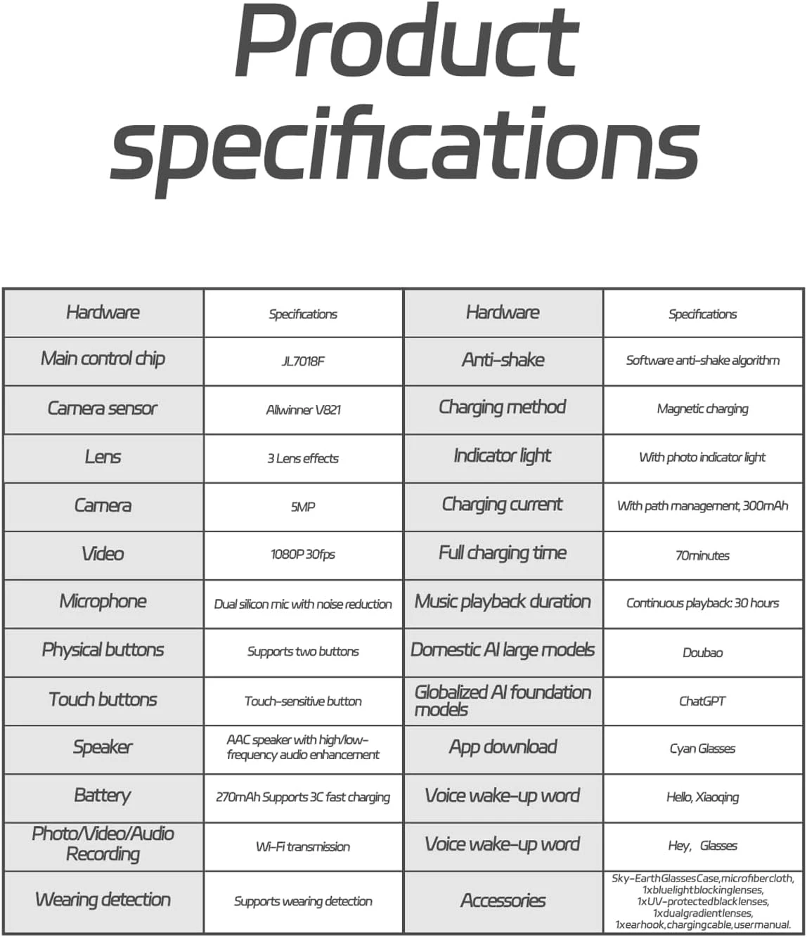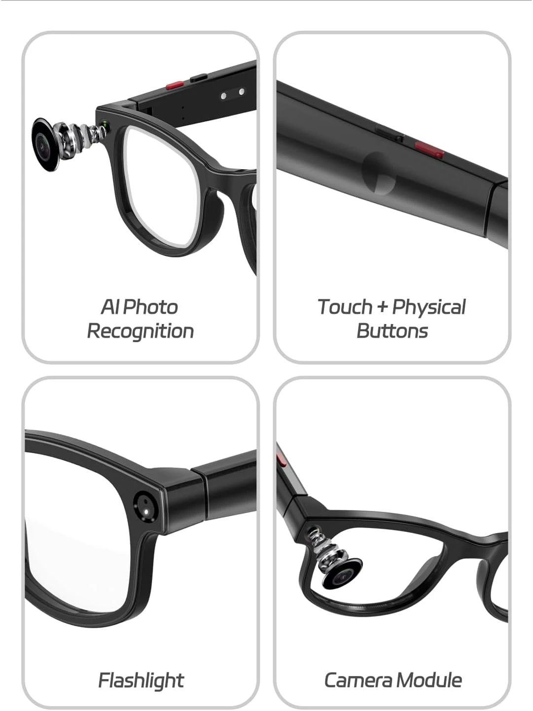 Fonctions : appel vocal, lecteur de musique, photo IA, reconnaissance intelligente, enregistrement discret