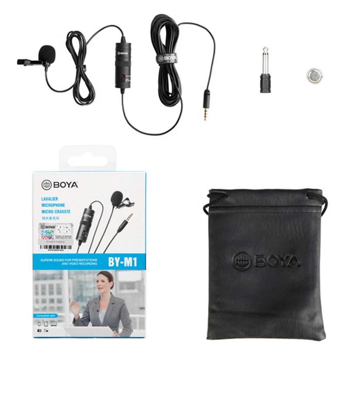 1 microphone Boya, 1 clip de cravate, 1 bonnette en mousse, 1 adaptateur jack 6,35 cm, 1 pile LR44, 1 manuel de l’utilisateur.