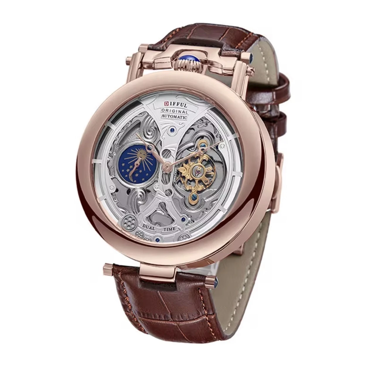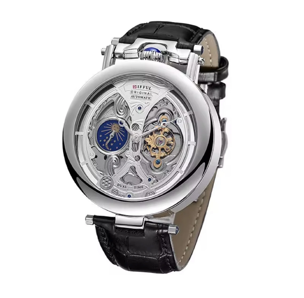 Cette montre automatique de la marque DIFFUL séduit par son cadran squelette qui dévoile la précision de son mécanisme interne. Son design raffiné est rehaussé par des détails bleus élégants et une finition brillante. Elle fonctionne sans pile, grâce aux mouvements naturels du poignet. Le bracelet en cuir apporte une touche de luxe et de confort. Un modèle parfait pour allier style et sophistication au quotidien.