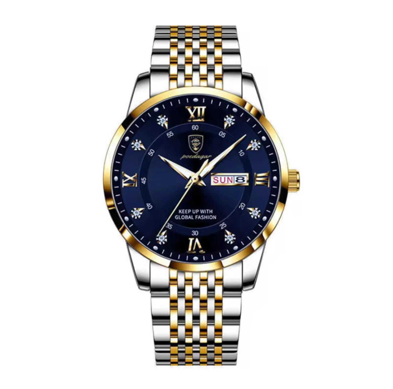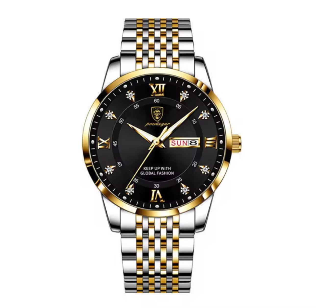 Découvrez cette superbe montre au design raffiné, qui allie l’élégance intemporelle au luxe contemporain. Son cadran noir rehaussé de chiffres romains dorés et d’index sertis façon diamant lui confère une allure prestigieuse.