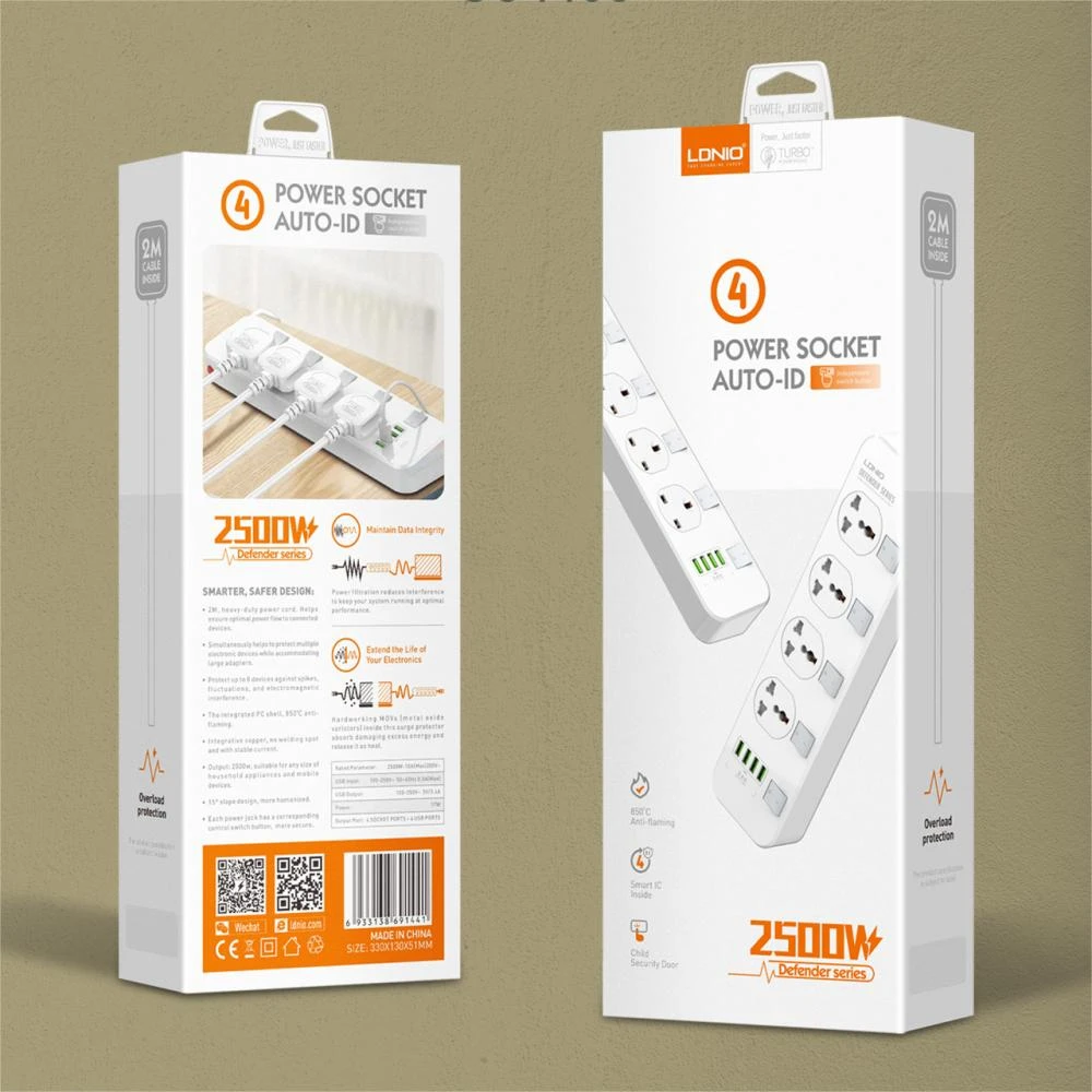 La multiprise LDNIO Power Socket Auto-ID est conçue pour offrir puissance, sécurité et praticité. Avec ses 4 prises universelles et 4 ports USB intelligents, elle permet de brancher et recharger plusieurs appareils simultanément, que ce soit au bureau, à la maison ou en voyage.