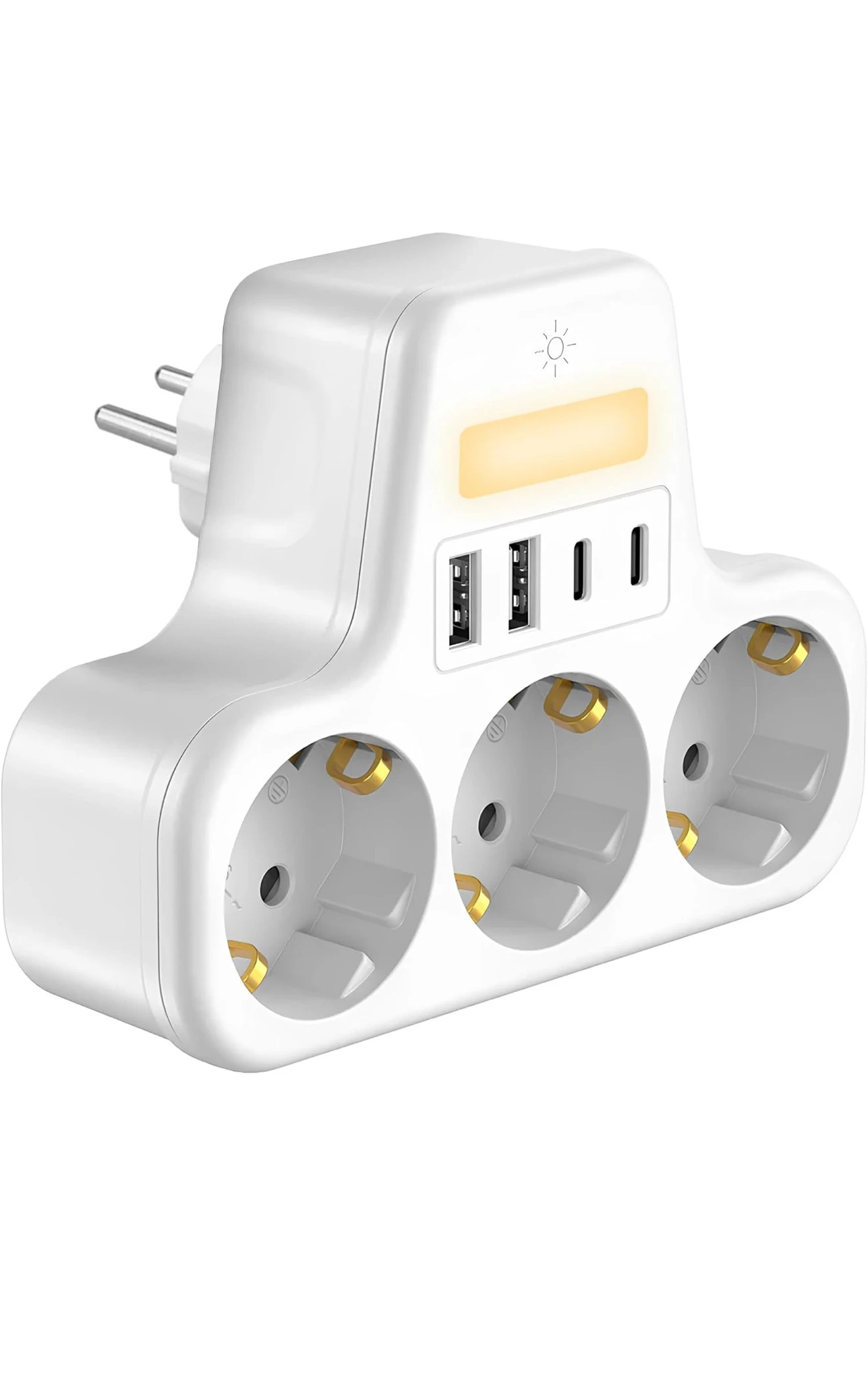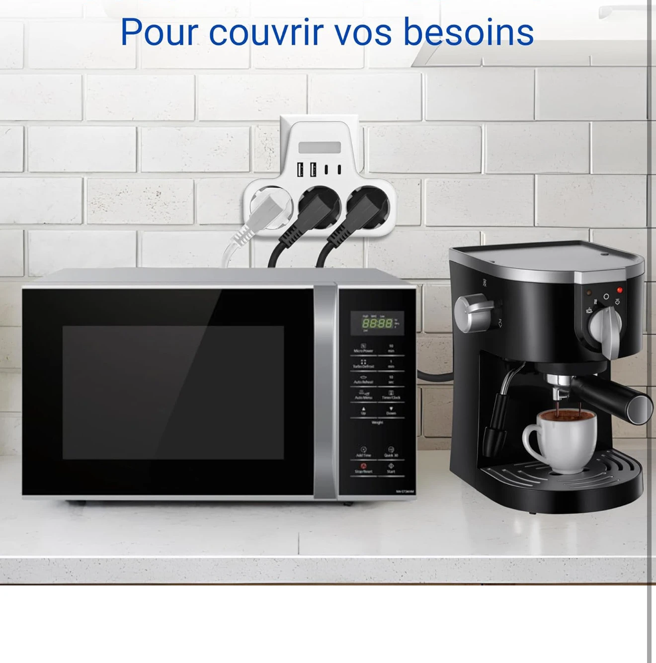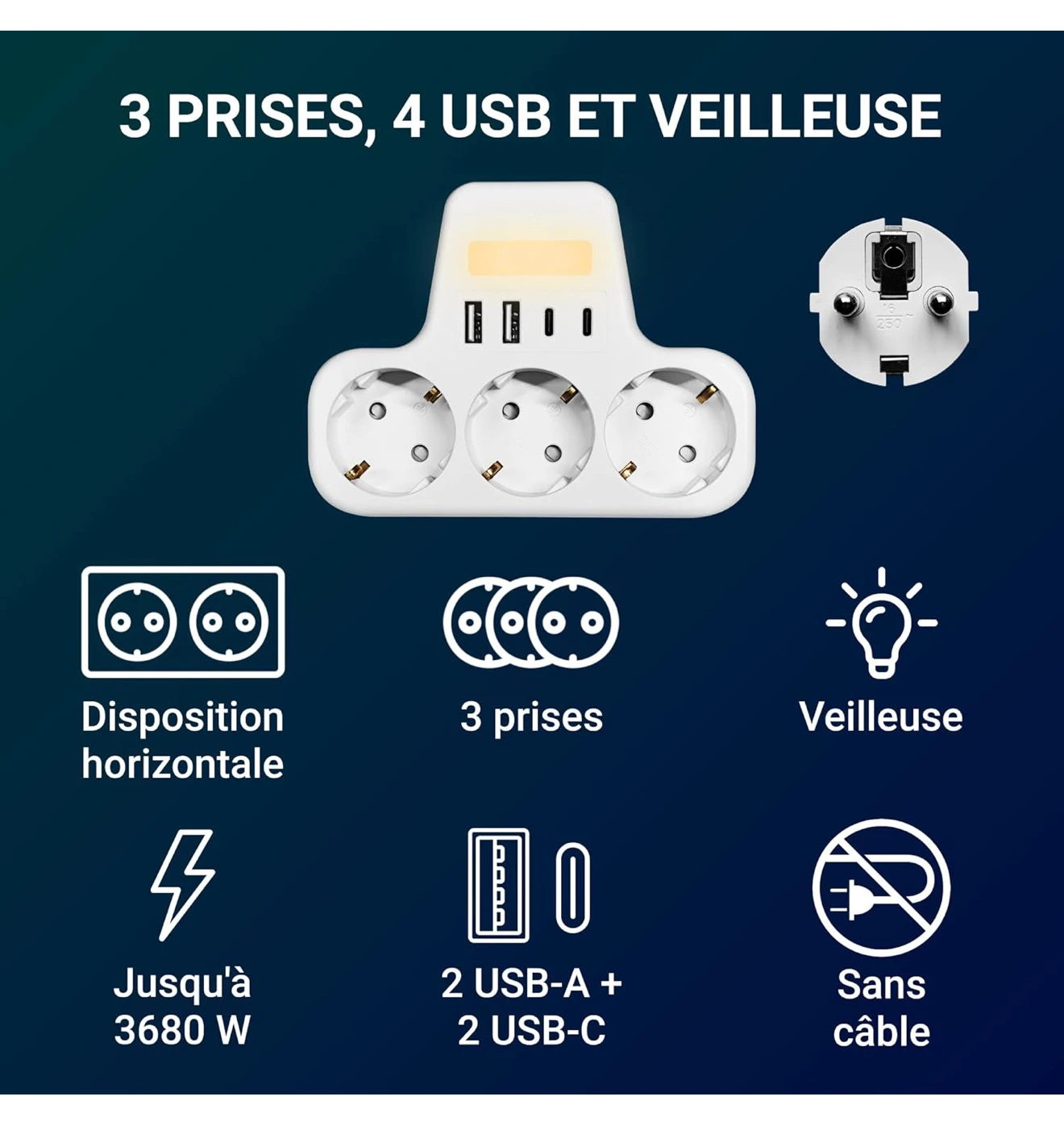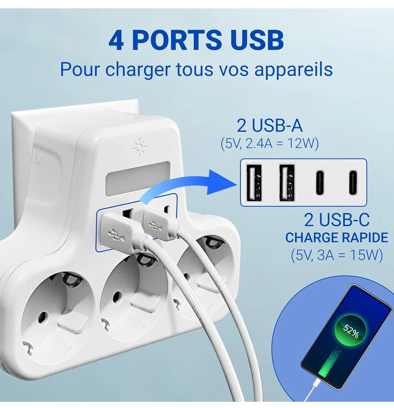 MULTIPRISE AVEC USB : Comprend également 2 ports USB-A et 2 ports USB-C à charge rapide pour que vous puissiez recharger votre téléphone ou tout autre appareil. Cette triplette electrique supporte jusqu’à 2500W, 16A et 250V, idéale pour connecter plusieurs appareils à forte consommation sans souci. Conçue selon les normes de sécurité européennes.