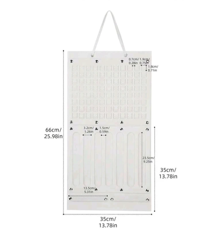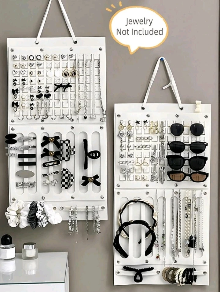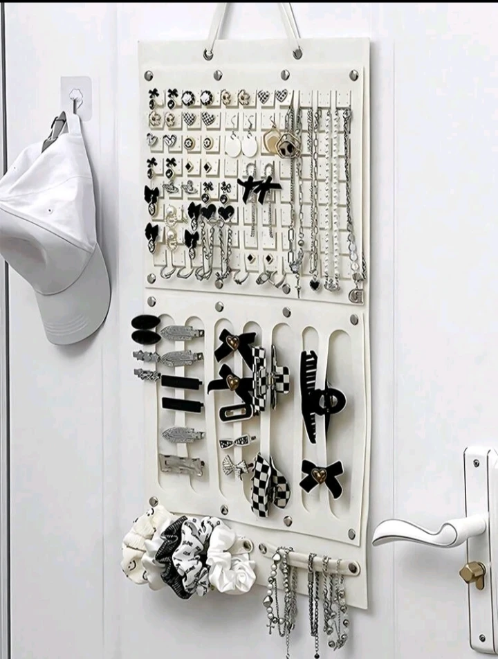 Organiseur mural pour bijoux – pratique et chic, cet accessoire à suspendre est doté de multiples pochettes transparentes à l’avant pour ranger boucles d’oreilles, bagues, bracelets, et de crochets à l’arrière pour colliers et chaînes. Idéal pour garder vos bijoux bien organisés, visibles et sans nœuds, tout en économisant de l’espace dans votre chambre ou dressing. Accessoires non inclus.