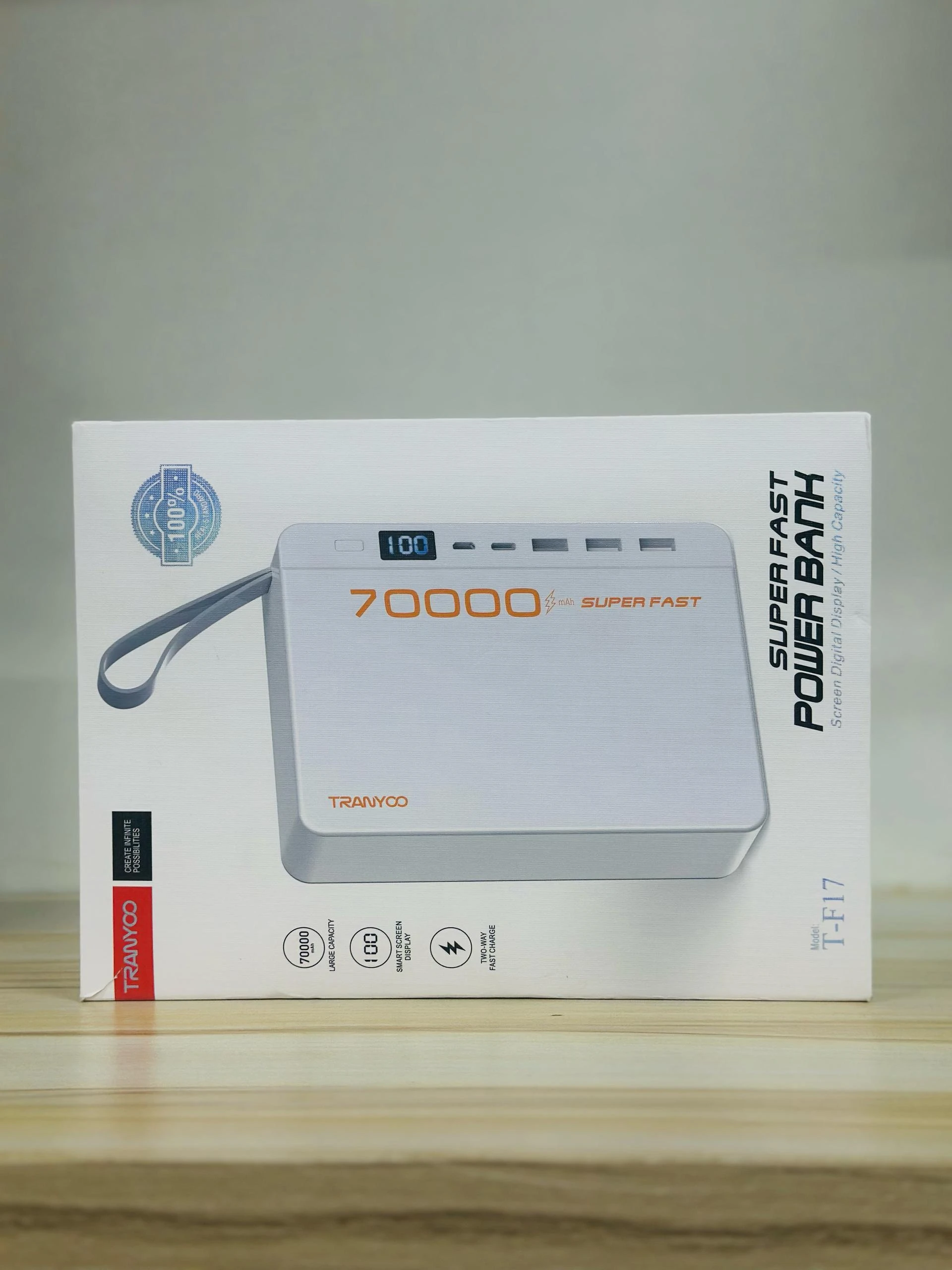 La Tranyoo T-F17 est une power bank haute capacité de 70 000 mAh, idéale pour charger plusieurs appareils en déplacement, au bureau ou en voyage.