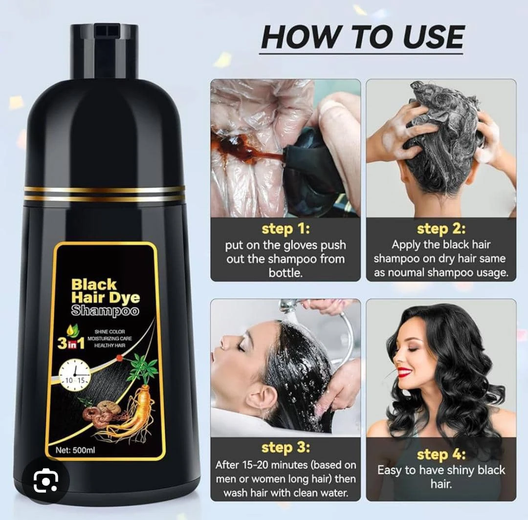 Notre Black Hair Dye Shampoo 3 en 1 est bien plus qu’un simple colorant : il nettoie, hydrate et donne une teinte noire éclatante en seulement 10 à 15 minutes.