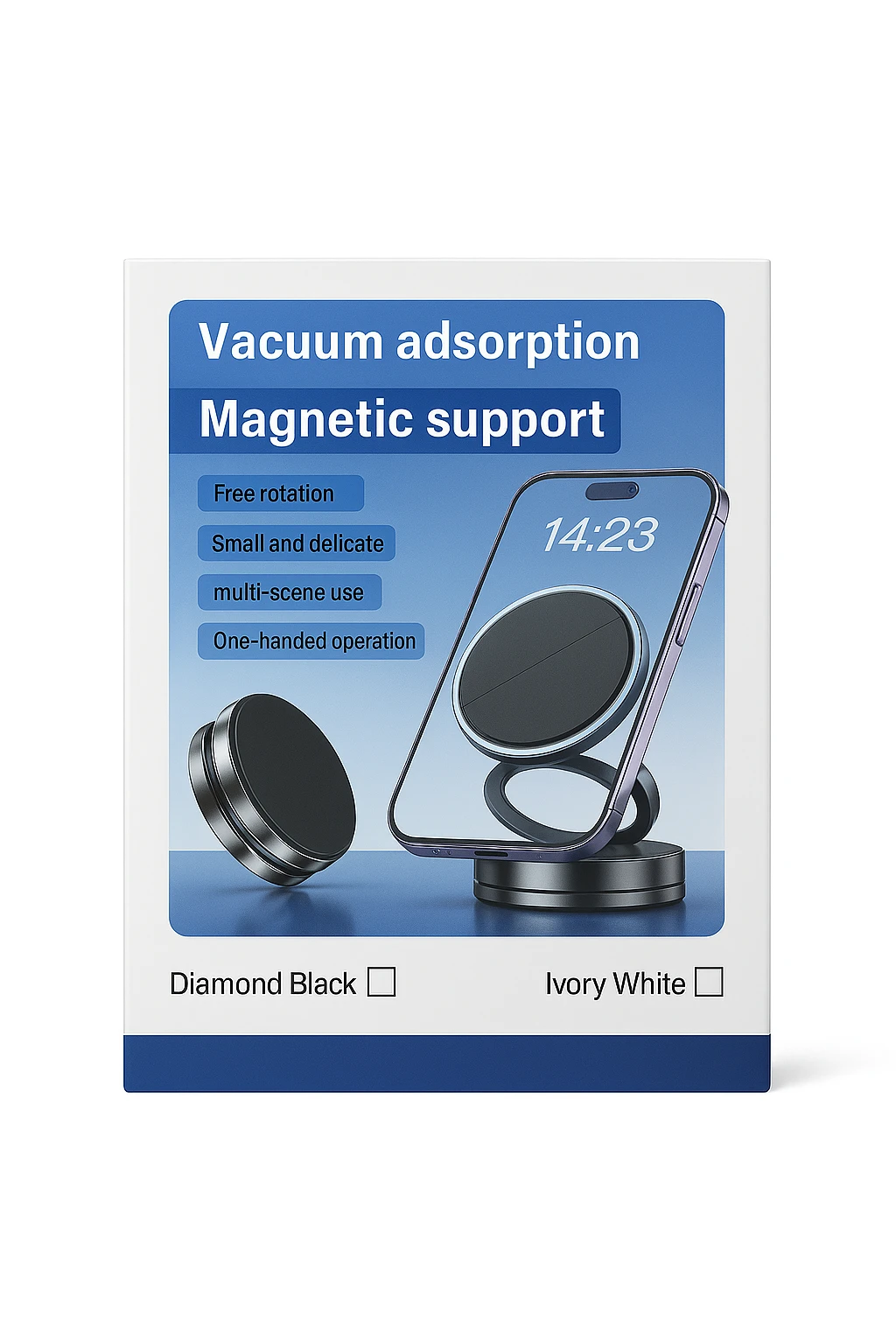 1. Support Magnétique – Vacuum Adsorption Magnetic Support Support magnétique compact offrant une fixation puissante et une rotation à 360°. Idéal pour voiture, bureau ou maison. Design élégant, installation rapide et utilisation à une main.