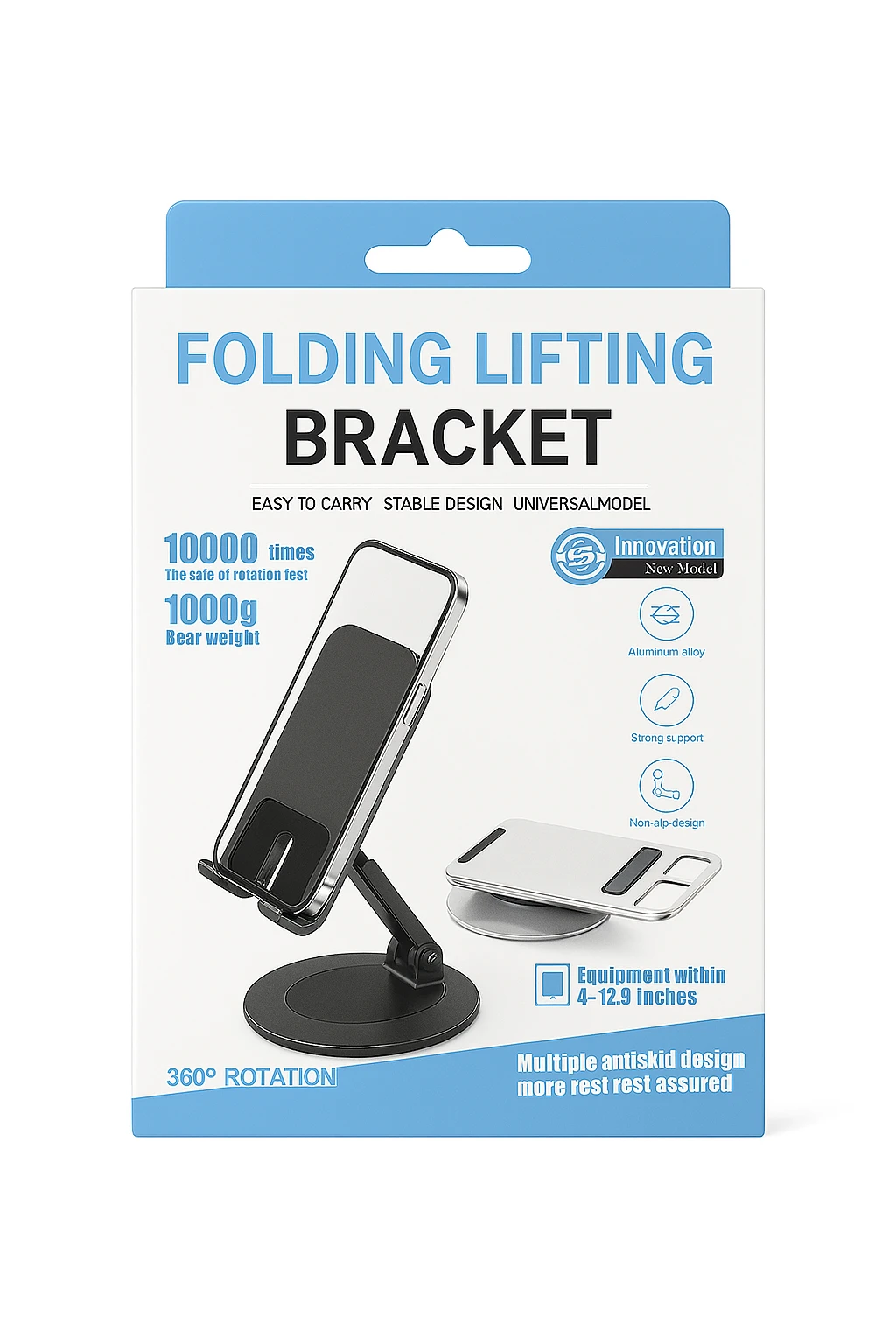3. Support Pliable – Folding Lifting Bracket Support ajustable avec rotation 360°, hauteur réglable et structure robuste. Compatible smartphones et tablettes (4 à 12,9 pouces). Idéal pour le bureau et les voyages.