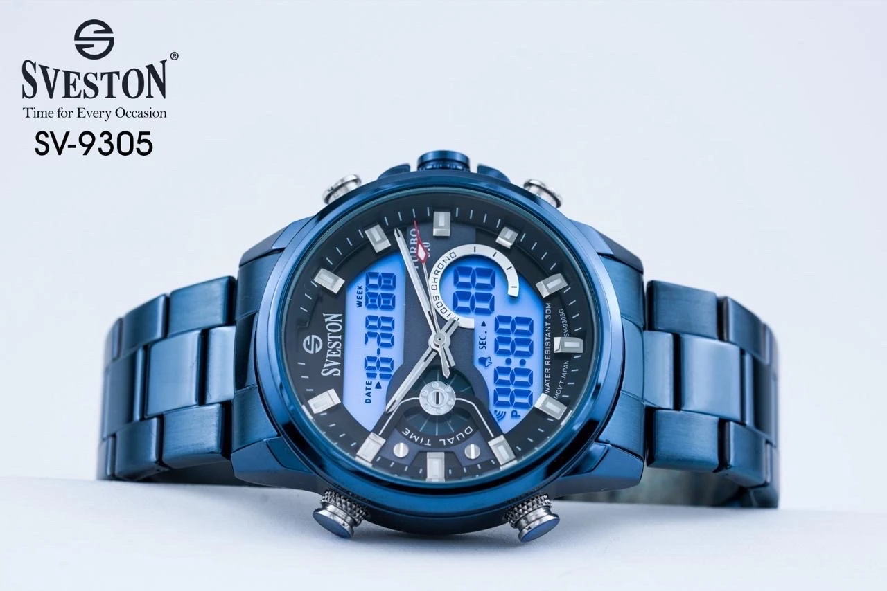 Design audacieux en acier inoxydable bleu, avec une finition soignée et un cadran lumineux combinant affichage analogique et digital