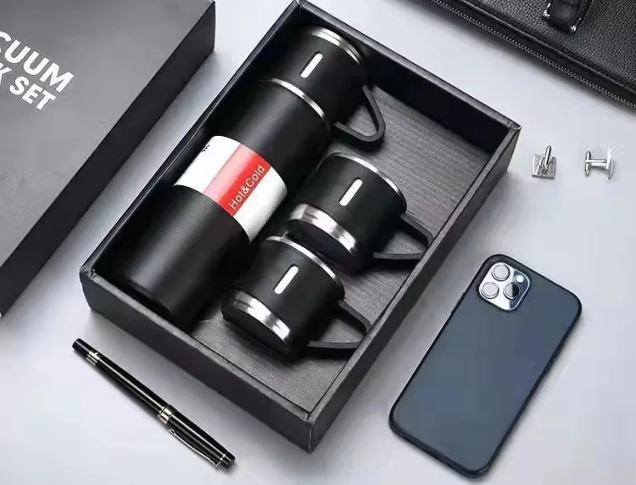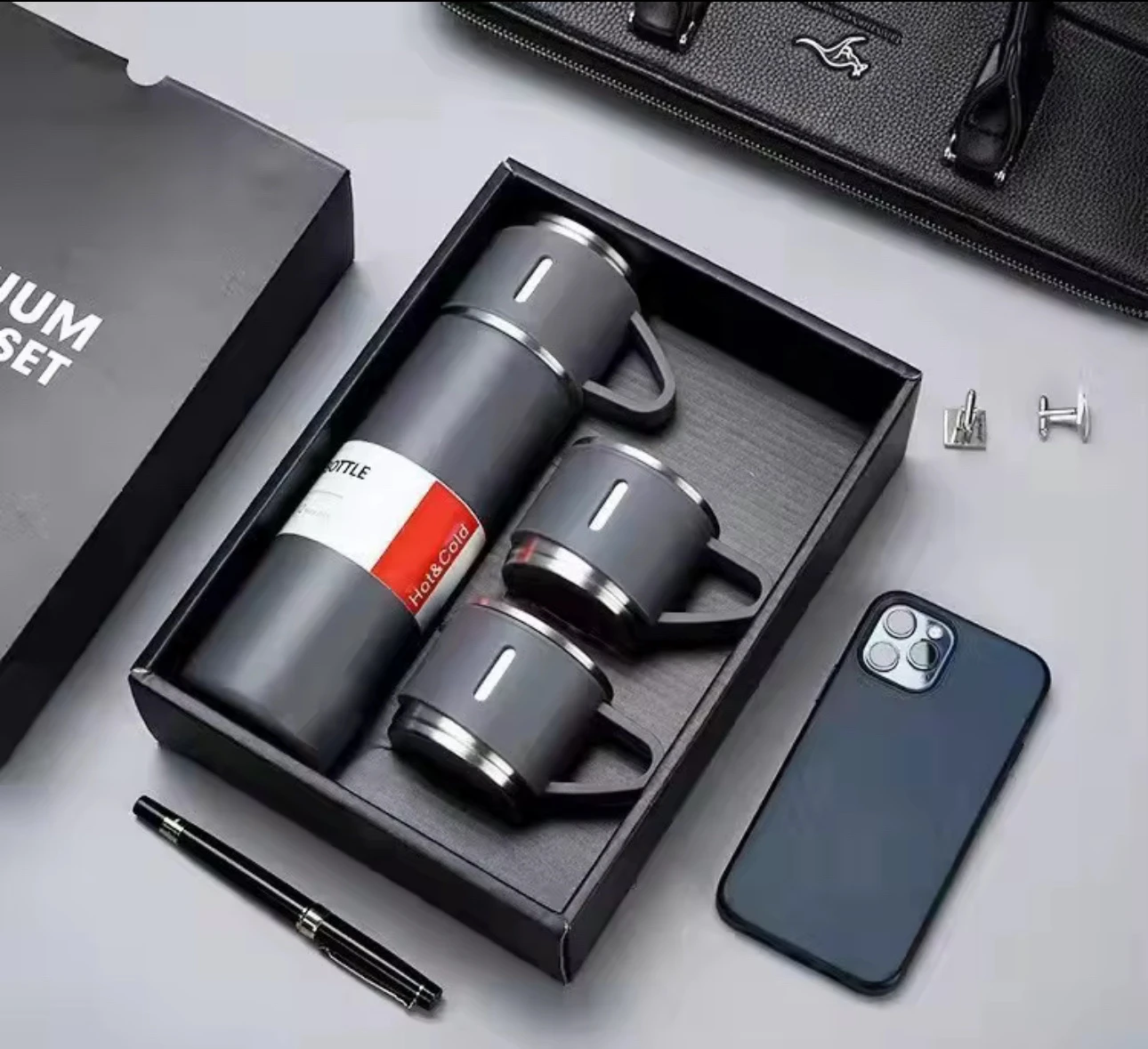 Thermos en acier inoxydable idéale pour vous permettre d’avoir vos boissons toujours au chaud; facile à transporter Caractéristiques : Facile à transporter dans vos voitures lors de vos voyages au bureau et même usage domestique......Volume: 500ml Avec 3 gobelets