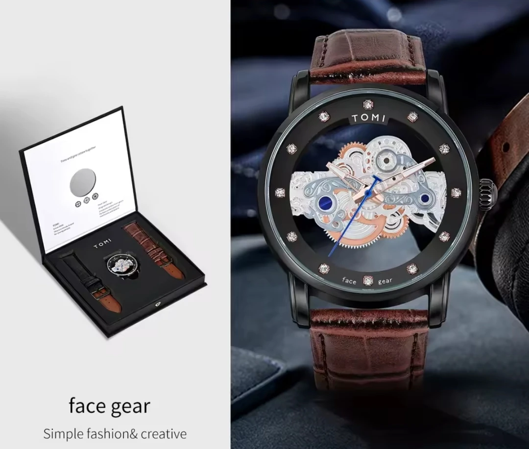 Montre de luxe Tomi Face Gear pour homme – Coffret élégant