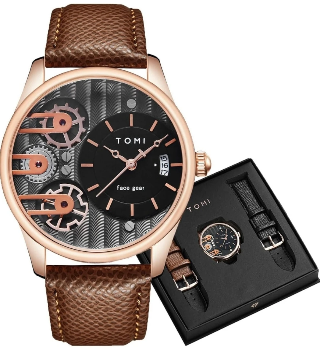 Montre de luxe Tomi Face Gear T-106-5 pour homme – Coffret élégant
