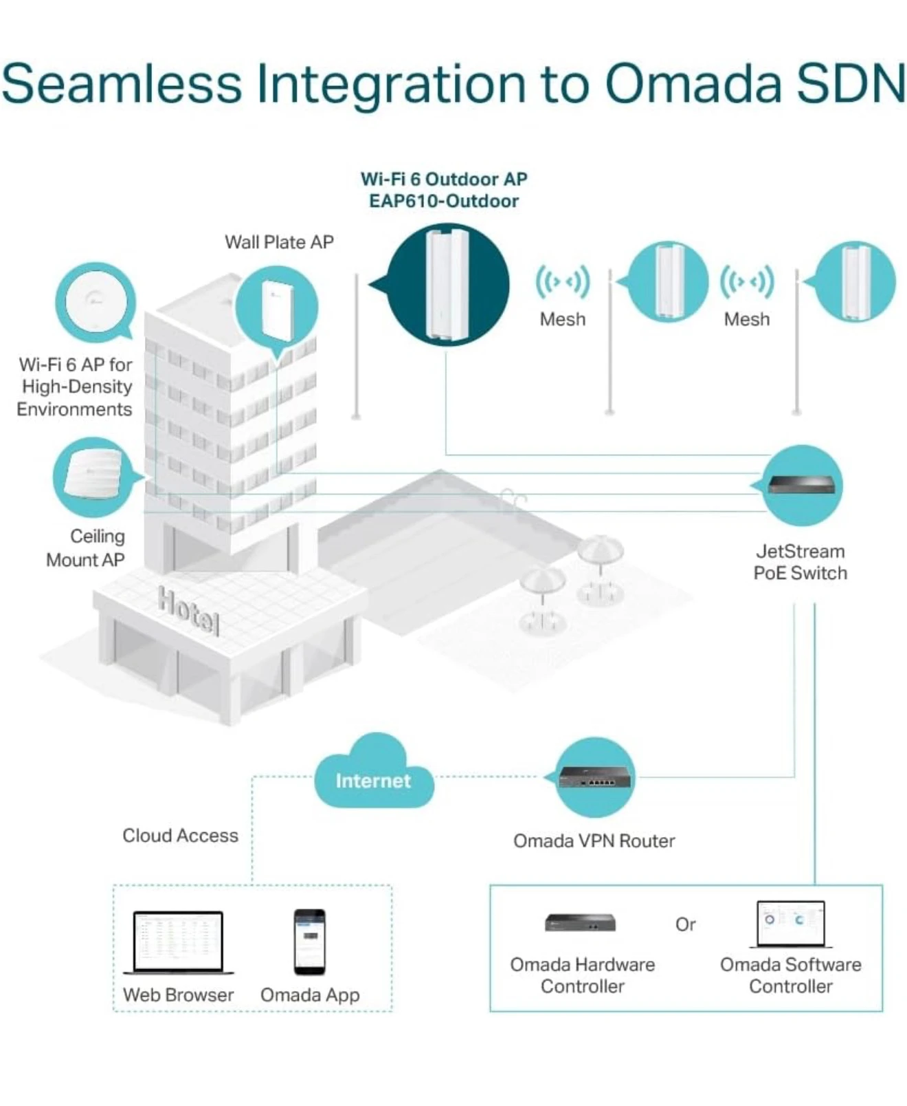 Point d’accès WiFi extérieur TP-Link Omada EAP610-Outdoor AX1800, offrant une connexion rapide et stable grâce au WiFi 6. Résistant aux intempéries (IP67), il dispose d’un port Gigabit Ethernet avec support PoE/PoE+ pour une installation simplifiée. Idéal pour les entreprises, hôtels, écoles ou espaces publics, il assure un roaming transparent et une couverture étendue avec la technologie Omada Mesh.