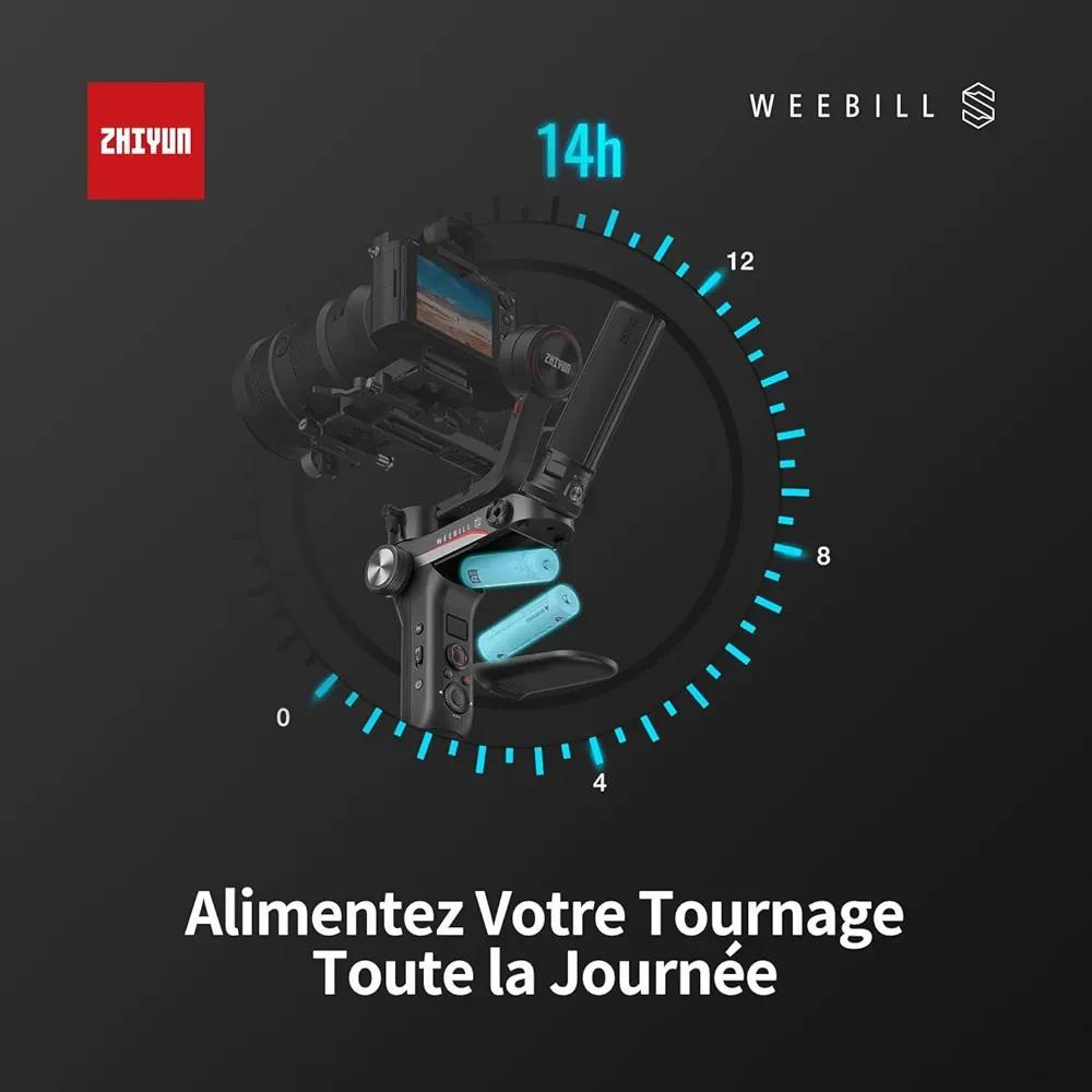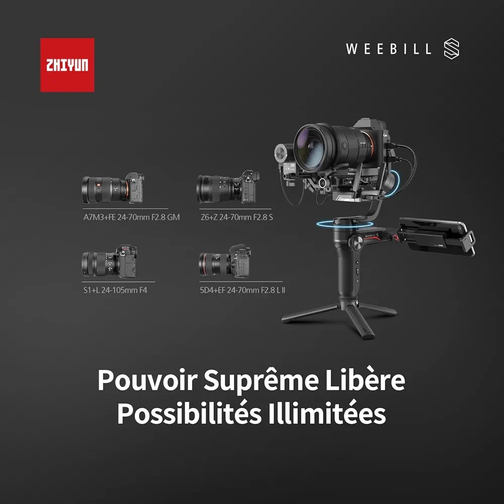 ZHIYUN Weebill S – Stabilisateur 3 axes léger et performant, conçu pour appareils photo DSLR et hybrides. Offre une stabilité dynamique exceptionnelle, idéal pour des prises de vue fluides et professionnelles. Compatible avec Canon, Sony, Panasonic, Nikon et Fujifilm.